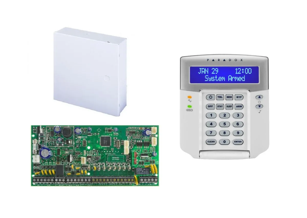 CENTRALA alarma PARADOX, panou control SP6000; 8 intrari de zona sau 16 cu ATZ, extensibila la 32 zone; extensibila la 16 iesiri PGM #> (2 pe placa); trigger PGM +/; intrare pentru detectori de fum, pe 2 fire, “SP6000+CUT+K32LCD”