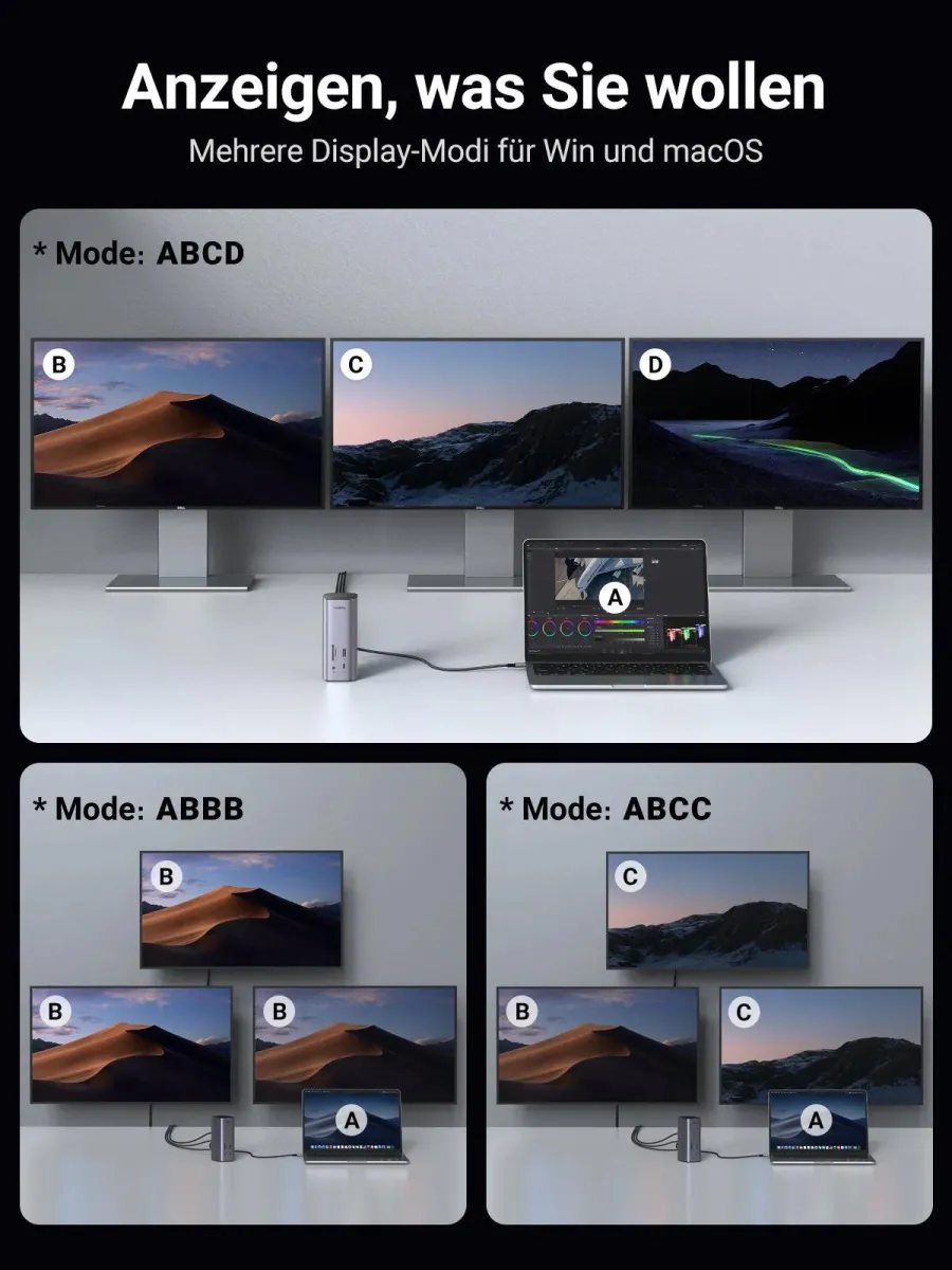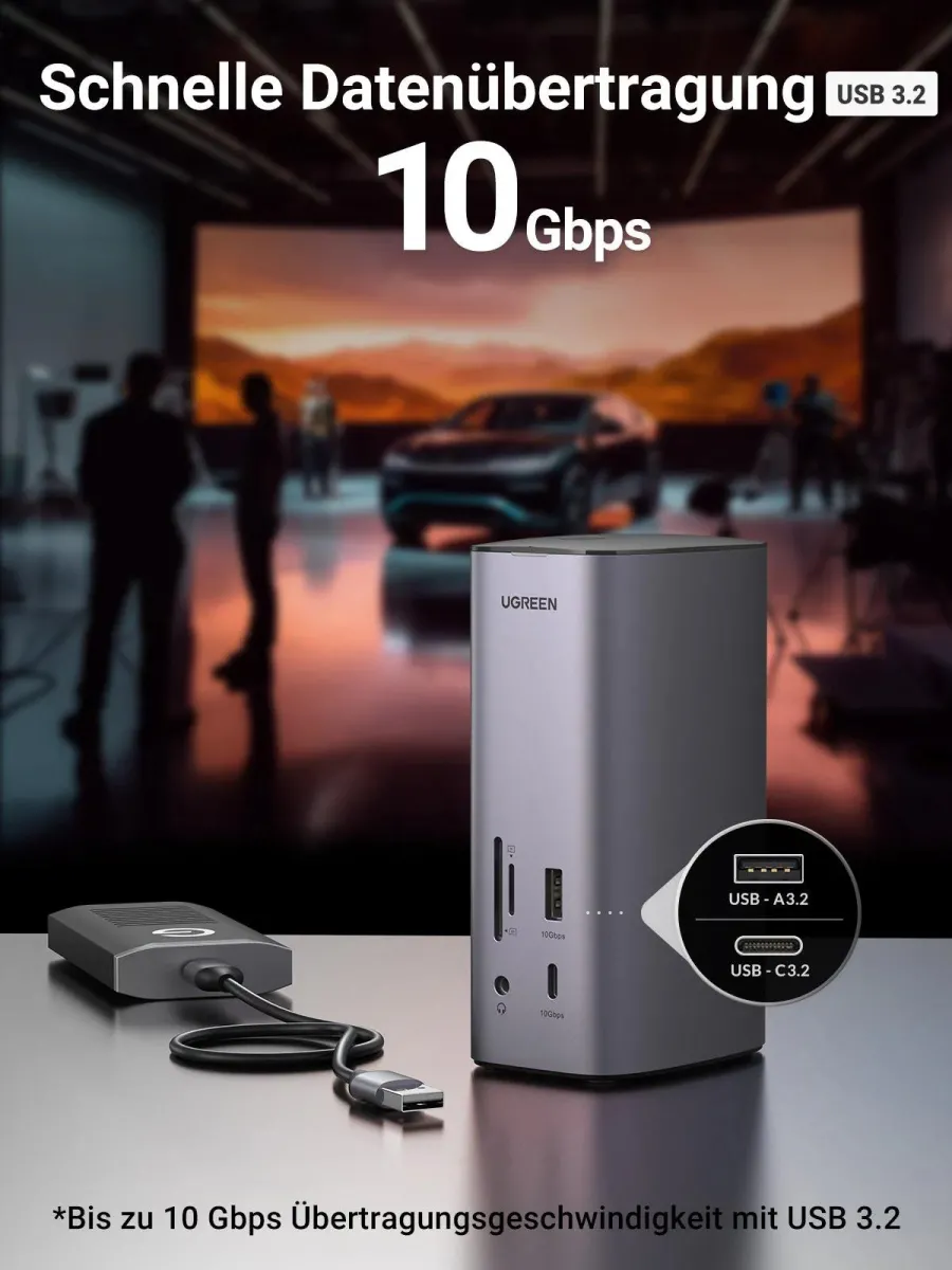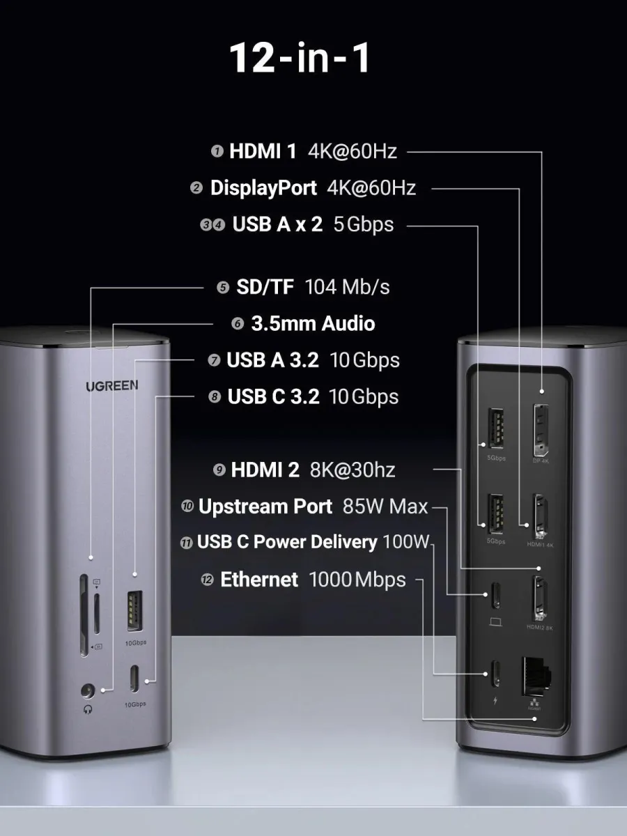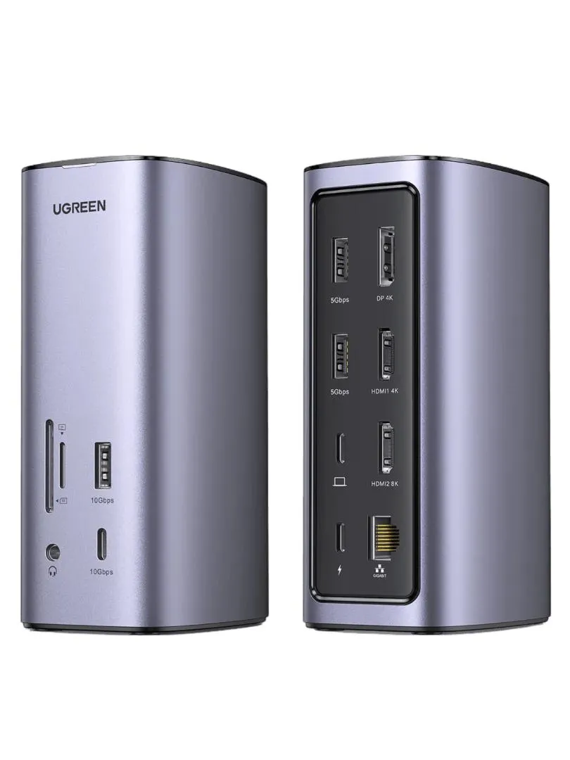 DOCKING Station Ugreen, “CM555” conectare PC USB Type-C, 1 x jack 3.5mm, SD/microSD Card Slot, 1 x DP Port 4K@60Hz, 1 x RJ-45 Gigabyte, 2 x HDMI 4K, 1 x USB Type-C PD 100W, 2 × USB-A 3.2 Gen 1, aluminiu, gri “90325” (timbru verde 0.8 lei) – 69573038