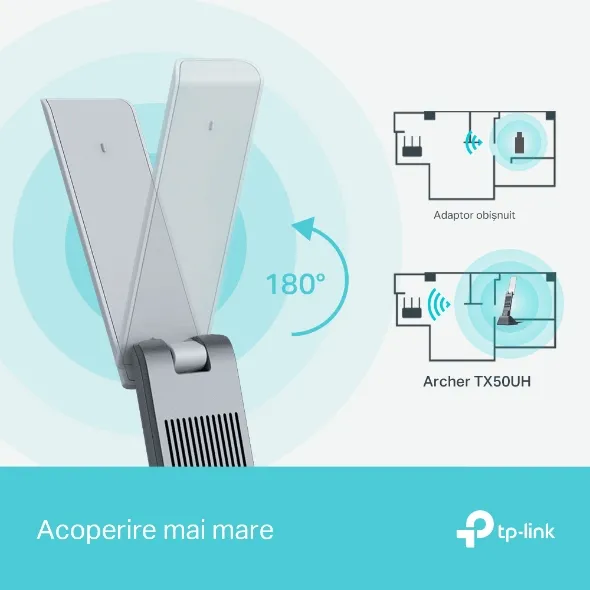 PLACA RETEA TP-LINK AX3000, extern wireless 2.4 GHz | 5 GHz, USB 3.0, port, 3000 Mbps, antena externa x 2, “Archer TX50UH” (include timbru verde 0.18 lei)
