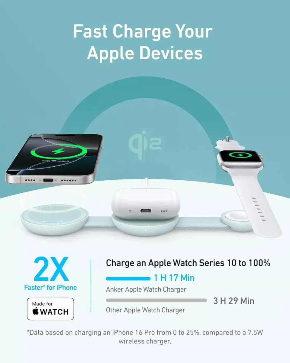 Stand cu incarcare wireless 3 in 1 Anker, MagGo 3-in-1, 15W, portabil, pliabil, fast charge, pentru iPhone seriile 12-16, Apple Watch, AirPods, 1 x USB-C incarcare, verde, “B25M8H61” (timbru verde 0.18 lei) – 0194644286712