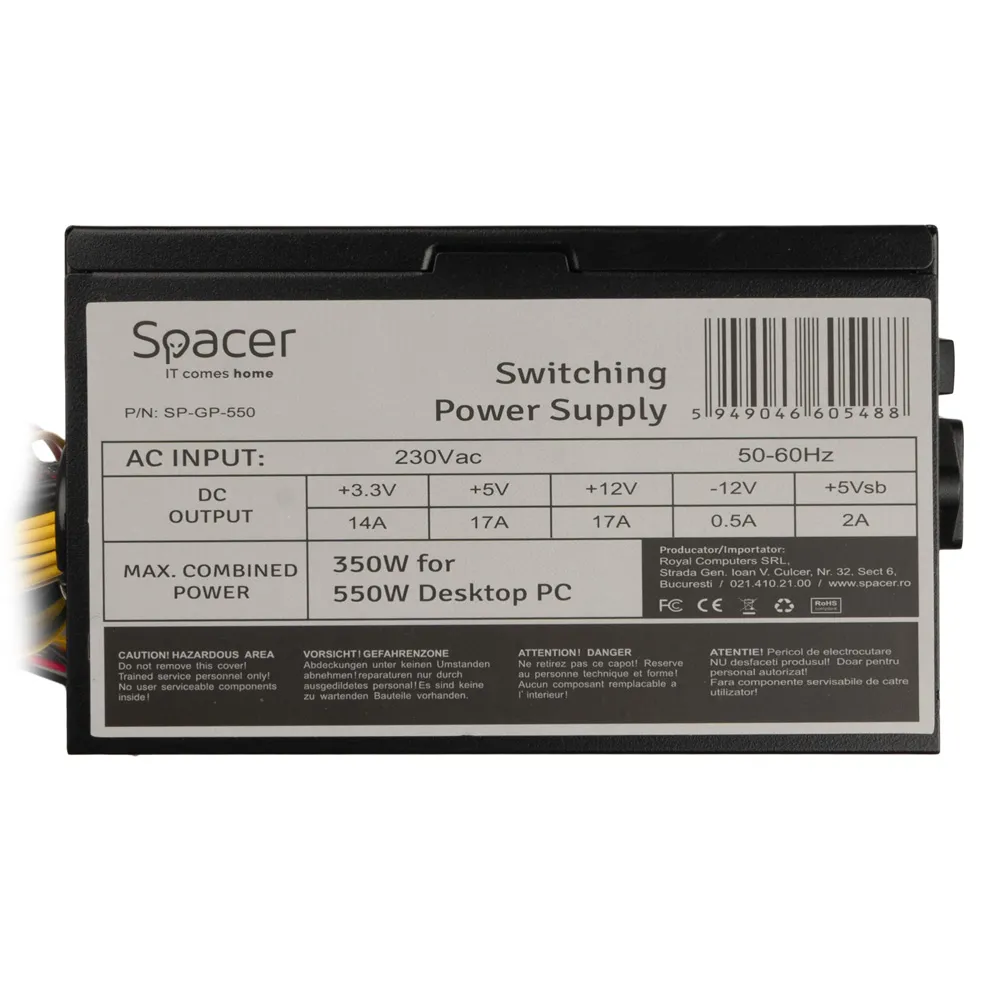 SURSA SPACER 550, 350W for 550 Desktop PC, PFC pasiv, fan 120mm, MB (20+4) x1, CPU (4+4) x1, PCI-E (6) x1, SATA x4, Molex x2, *retail* “SP-GP-550”, (timbru verde 0.8 lei)