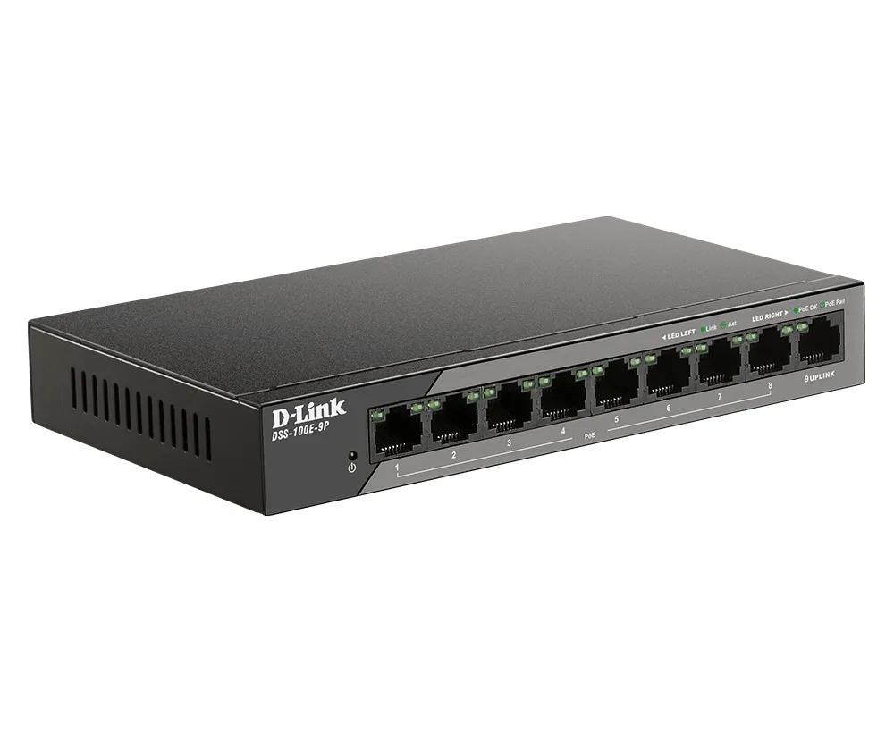 SWITCH PoE D-LINK Unmanaged 8 porturi 10/100Mbps (8 PoE) + 1 x Gigabit Uplink, carcasa metalica, “DSS-100E-9P”(timbru verde 2 lei)